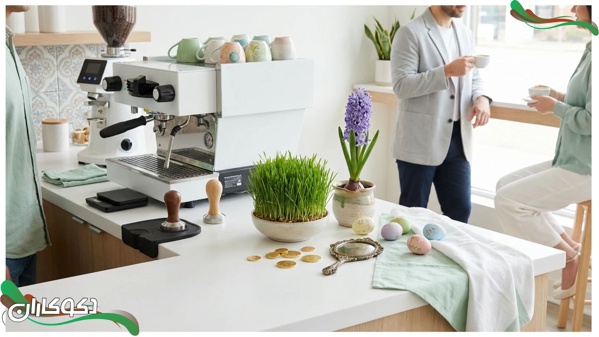 - شب یلدا: در شب چله، کافی بار را با انار، هندوانههای کوچک تزئینی، شمعهای قرمز و یک شعرنامه حافظ تزئین کنید. یک سینی چای و شیرینی کنار دستگاه قهوه، دوگانگی زیبای سنت و مدرنیته را نشان میدهد.